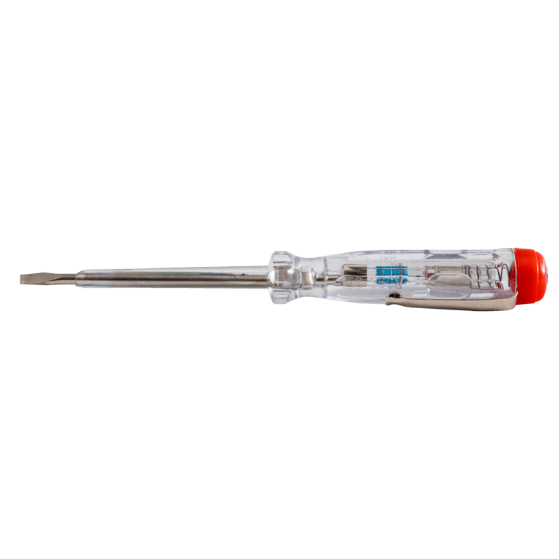 Chroom-vanadiumstaal, glansvernikkeld met geisoleerd lemmet, lengte 65 mm, bladbreedte 3 mm, gehele lengte 140 mm. Voor spanningen van 100-250 Volt, met doorzichtig plastic hecht en vestzakclip