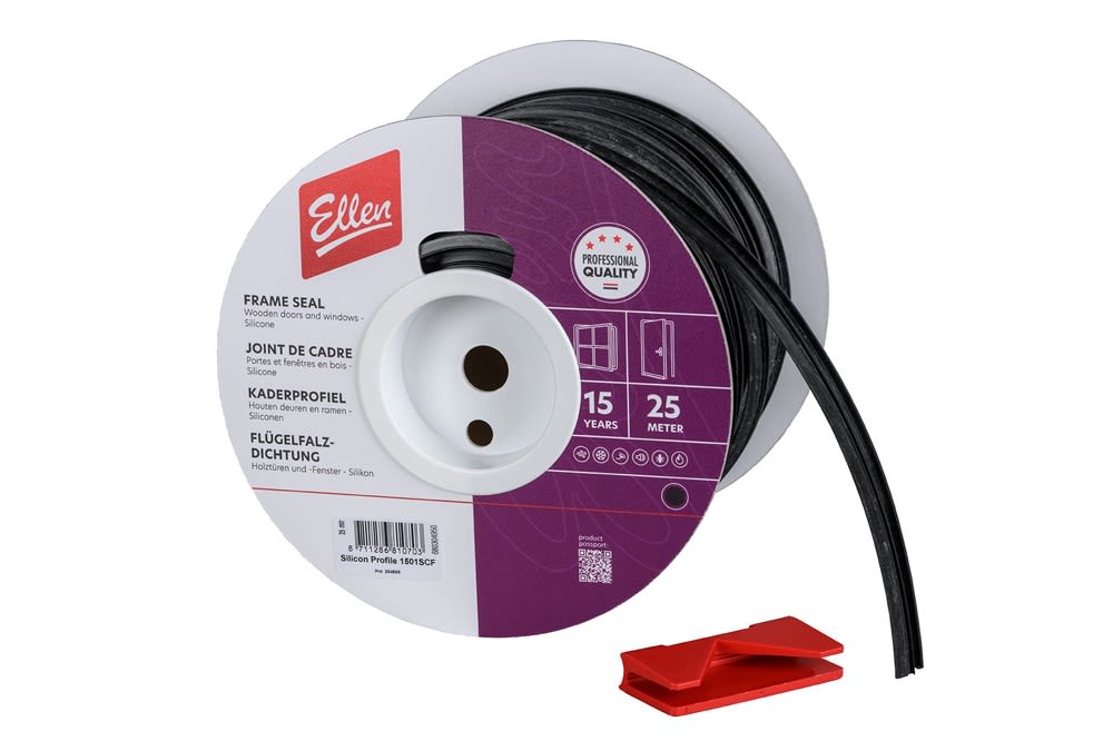 Tochtwerend kaderprofiel voor raam en deur. Kieren en naden zijn goed af te sluiten door de montage van het siliconen kaderprofiel. Het soepele siliconen heeft een lage sluitweerstand en is eenvoudig op maat te knippen, ook in verstek. De 25 meterrollen worden geleverd met een handige snijhulp. Rondgaand kaderdichting voor ramen en deuren met een sponningbreedte van 15 mm. Uitermate geschikt als vervanging van bestaande kaderafdichtingen.