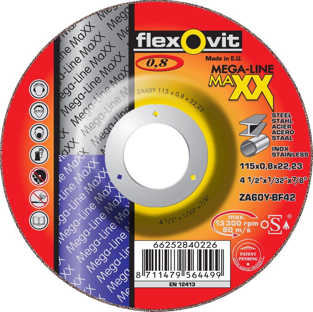 HomeVerbruiksartikelenSlijpmaterialenDoorslijpschijvenFlexovit Doorslijpschijf Maxx ZA60Y 125x0.8x22.2mm Vlak T42 Inox