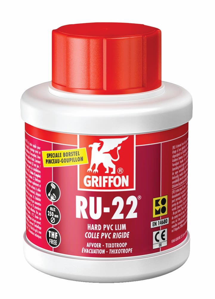 Griffon PVC lijm RU-22 is geschikt voor het verlijmen van buizen, moffen en fittingen met nauwe en ruimere passing (spleetvullend) in afvoersystemen. Geschikt voor diameters < 315mm.