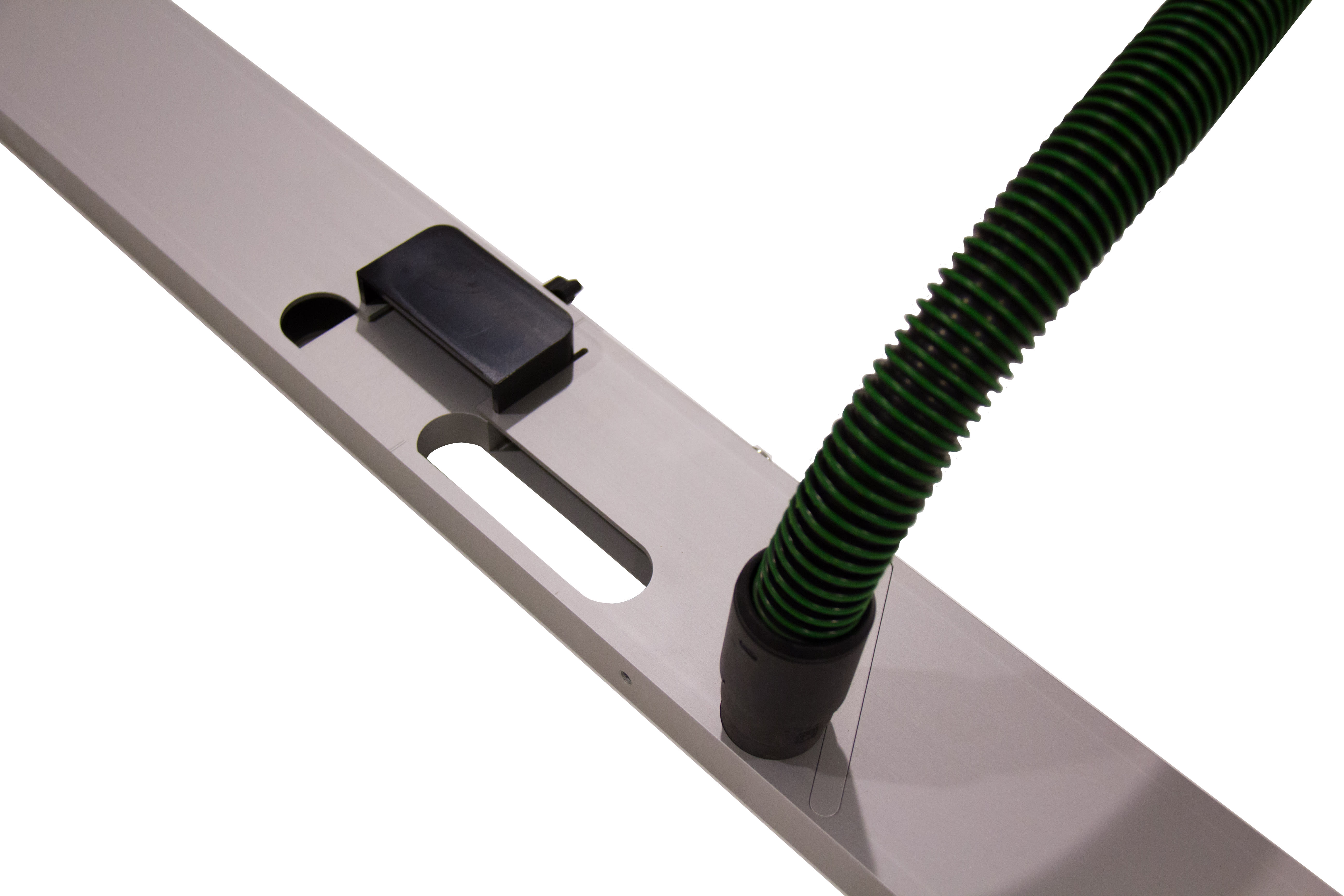 Aan de onderzijde van de sluitkomsparingen is een voorziening gemaakt waar een standaard stofzuigerslang in geplaatst kan worden. Doordat het profiel is dicht gemaakt wordt een gesloten omgeving gecreëerd, zodat een nog sterkere zuigkracht wordt gerealiseerd en fijnstof nog gemakkelijker wordt opgezogen.