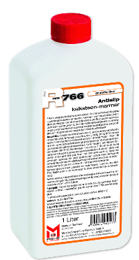 HMK R766 Antislip - kalksteen-marmer is een gebruiksklaar speciaal product. Het product verhoogt de grip op te gladde oppervlakken van marmer, kalksteen, marmercomposiet, betonsteen en terrazzo. Door de chemische reactie van R766 worden microscopisch kleine poriën gevormd, die onder natte omstandigheden de benodigde grip geven. Voor het hele oppervlak wordt behandeld, moet op een proefstuk van het oppervlak worden gekeken of Antislip het gewenste effect heeft.