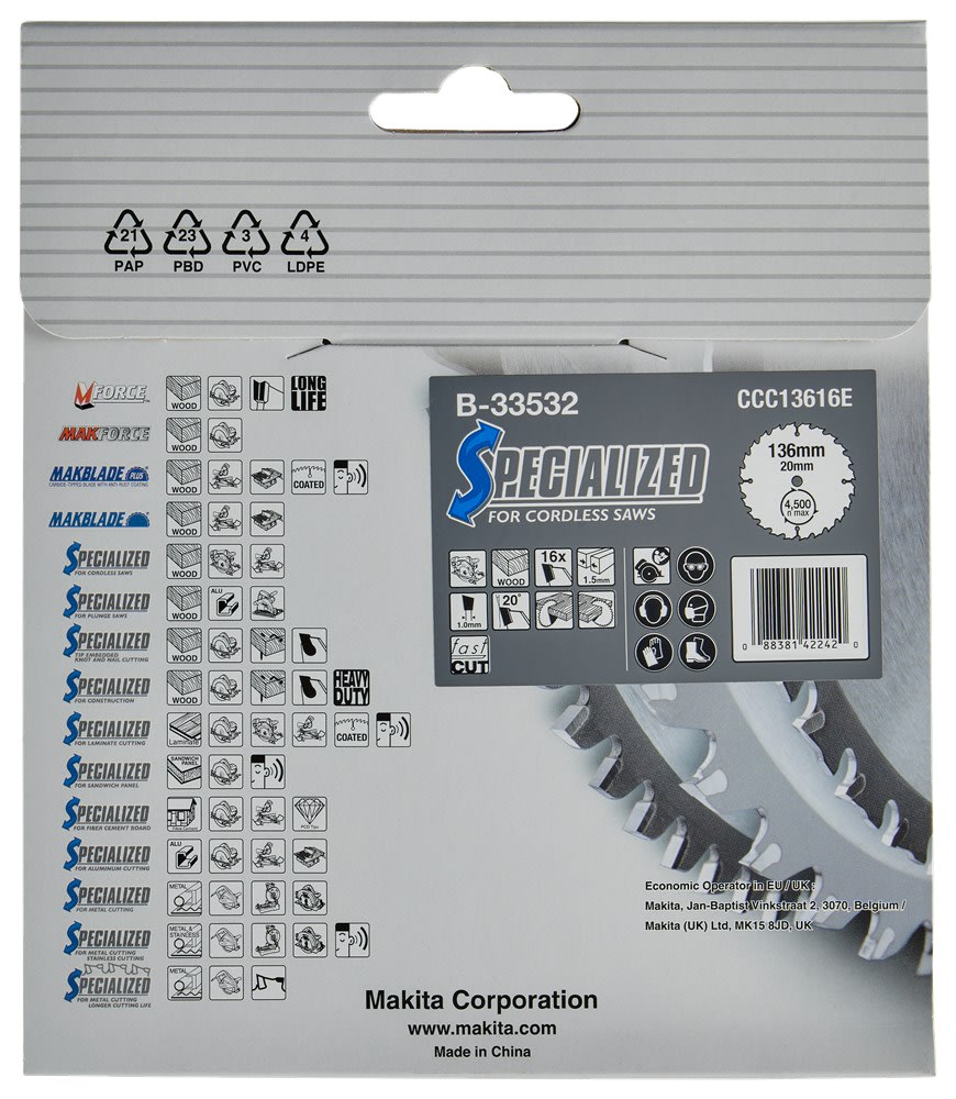 Makita heeft een uitgebreid assortiment cirkelzaagbladen voor de diverse machines. Kies een zaagblad voor het te zagen materiaal en passend op de te gebruiken machine; er zijn verschillende kwaliteiten, waarbij de Makita Efficut zaagbladen tot het top segment behoren. Voor meer informatie omtrent cirkelzaagbladen zie het Makita kenniscentrum: https://www.makita.nl/kenniscentrum/cirkelzaagbladen-en-de-technieken-erachter.html