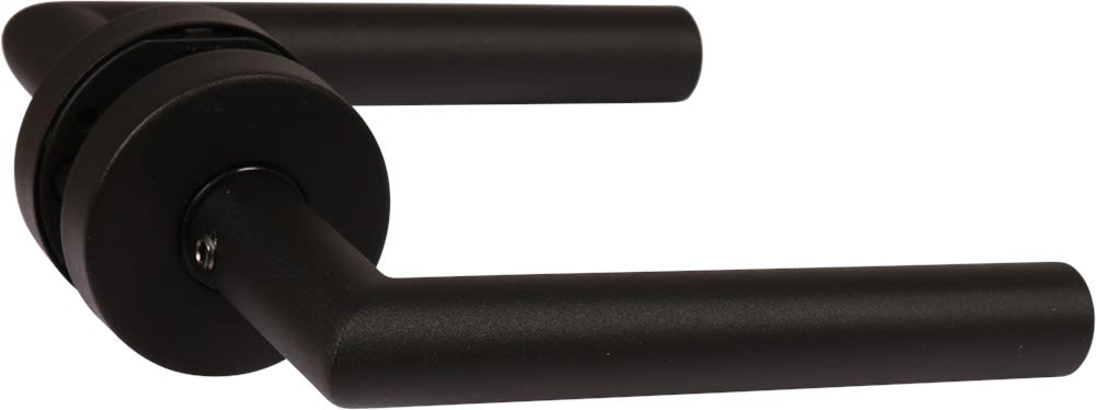 Model Tilburg (Haaks model deurkruk). Rvs AISI 304 (A2), zwart. Voorzien van kunststof onderrozet geveerd. Klasse 2.