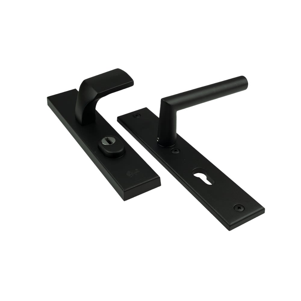 Oxloc Veiligheidsdeurgarnituur Duwer-Kruk Recht Veiligheidslangschild PC72 DIN Links/DIN Rechts Aluminium Zwart Met Kerntrekbeveiliging