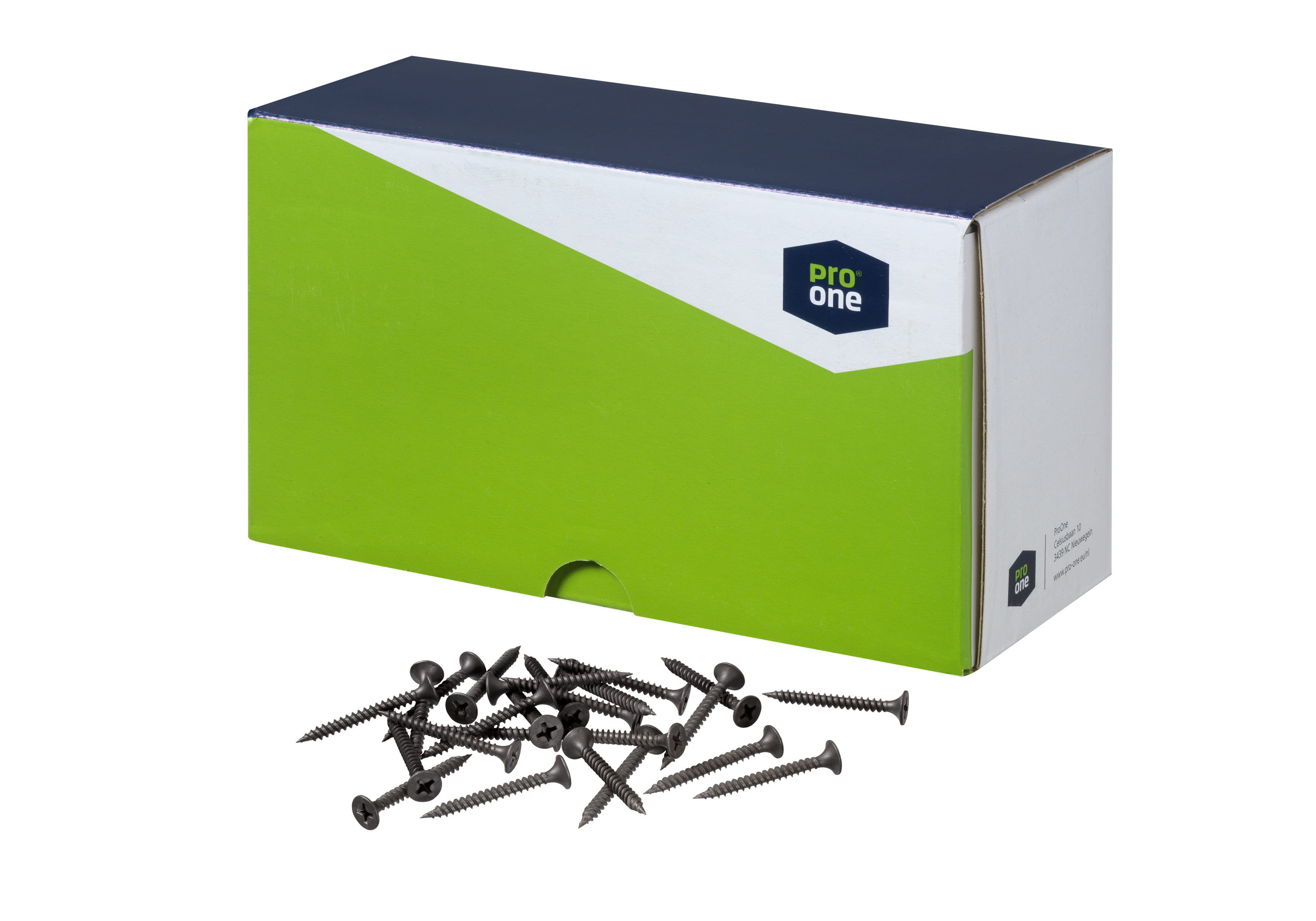 HomeBevestigingsmaterialenSchroevenSpaanplaatschroevenProOne Houtvezelschroef Premium 3,9x38mm Vlakkop Gefosfateerd 1000st