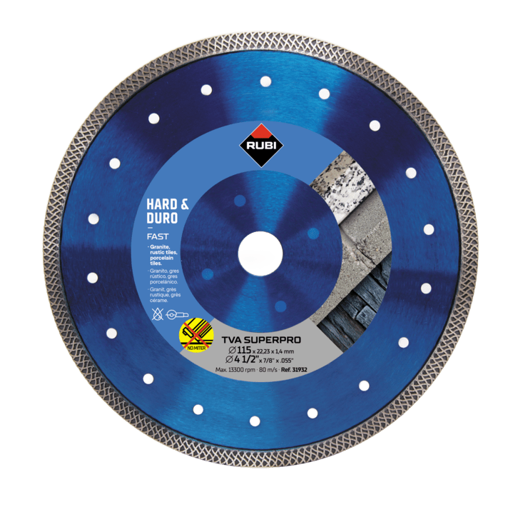 Door marktkennis en hard werken kan RUBI de tegelzetters de TURBO VIPER TVA zaagblad aanbieden. Het TURBO VIPER - TVA zaagblad wordt aanbevolen voor het droog zagen in harde materialen zoals graniet, klinkers, leisteen en natuurlijk in porseleinen tegels. Het specifieke ontwerp in de diamantrand van het TVA zaagblad biedt snellere zaagsnelheid in de hardste materialen zonder kwaliteitsverlies in de afwerking.