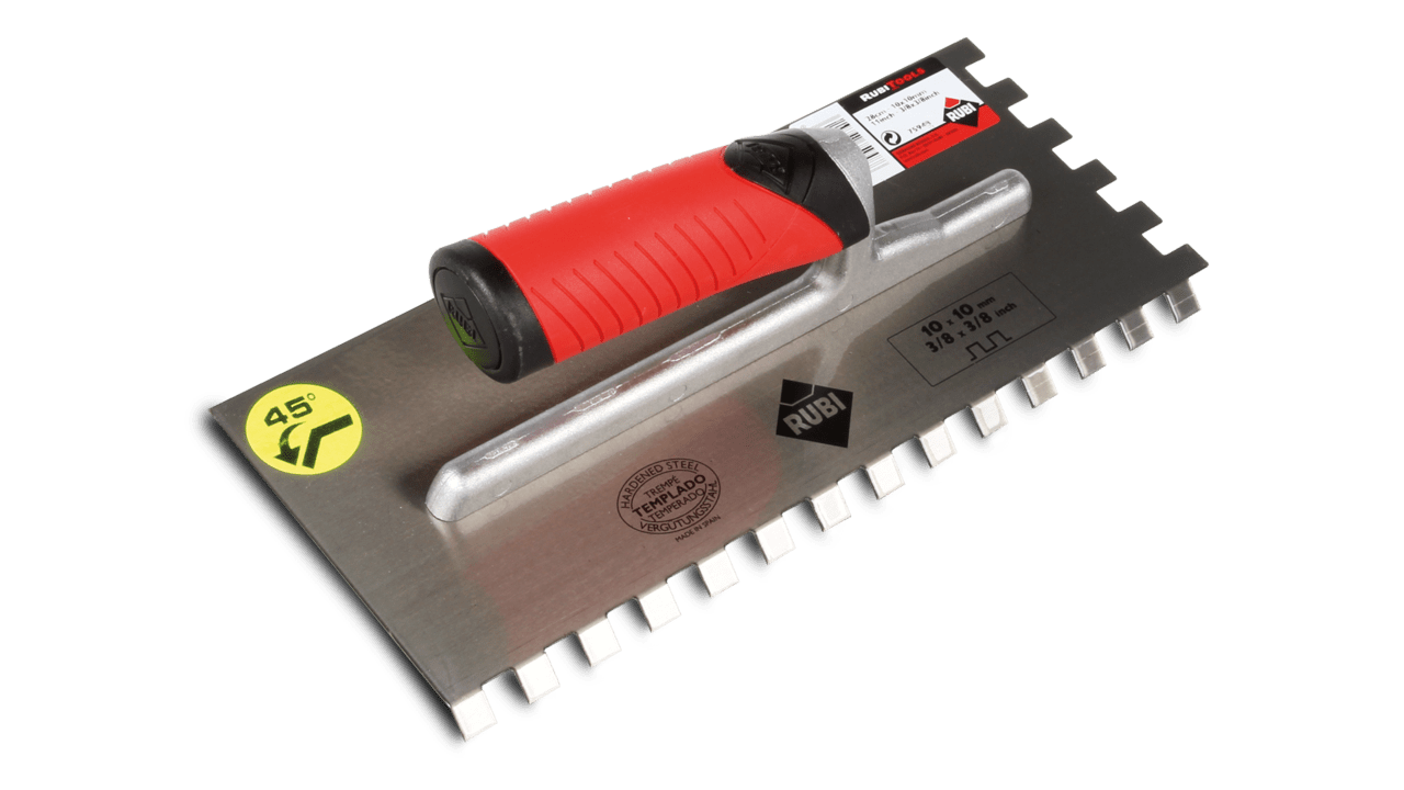 Schuine vertanding van 45º voor meer comfort en waardoor er minder kracht van de gebruiker nodig is. De mortel kan beter aan de werkoppervlakte bevestigd worden. Zeer licht en sterk aluminium middenstuk. Zeer stevige bevestiging tussen het middenstuk en het blad. Staalblad met hoge slijtvastheid. Ergonomische RUBIFLEX handgreep met twee texturen. Bescherming tegen corrosie door middel van kleurloze lak. Perfecte vlakheid van het blad.
