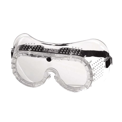 Stofbril met high impact blanke polycarbonaat lens, transparant frame met ventilatiegaten, zwarte elastische band en optische klasse 1.