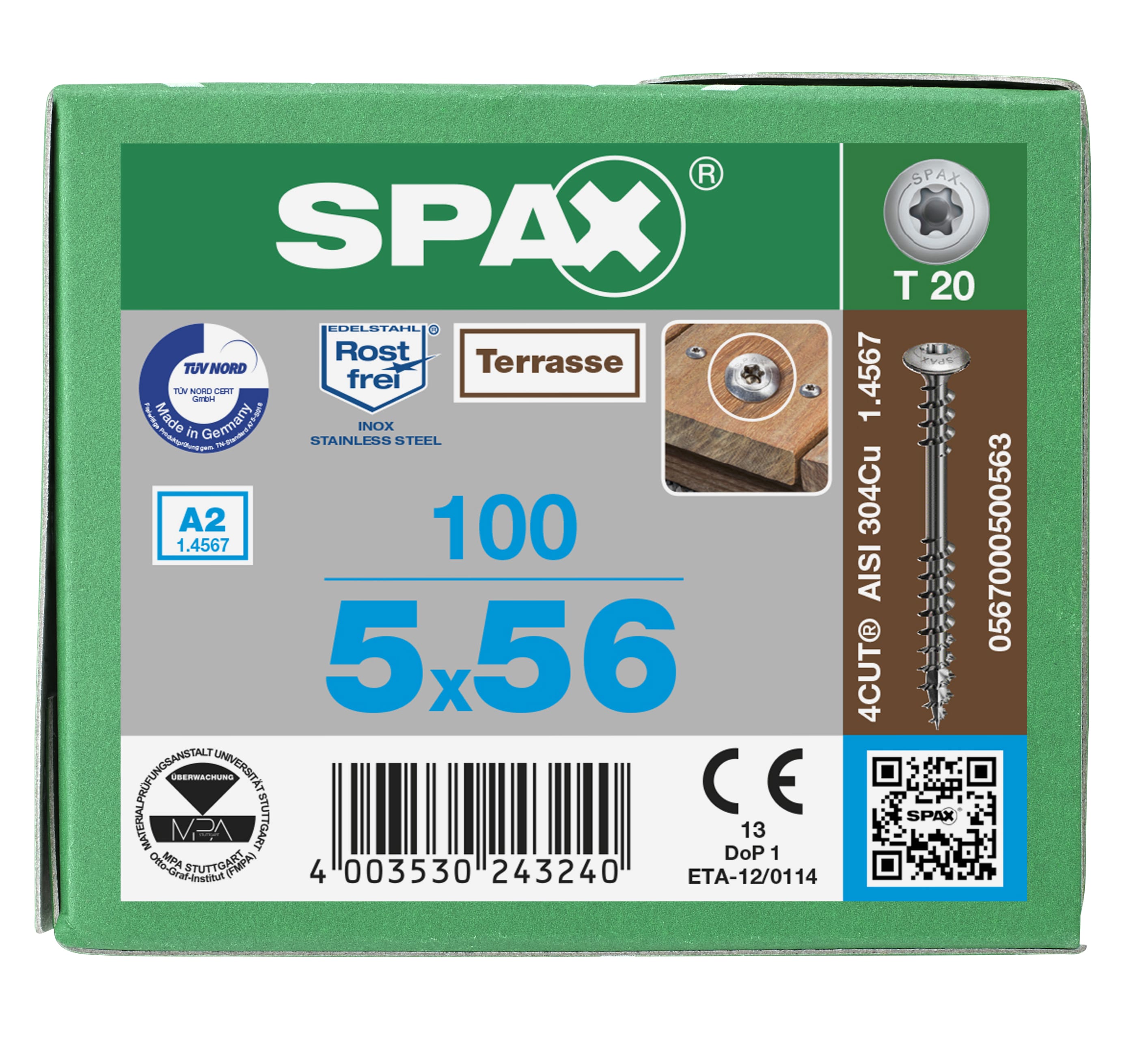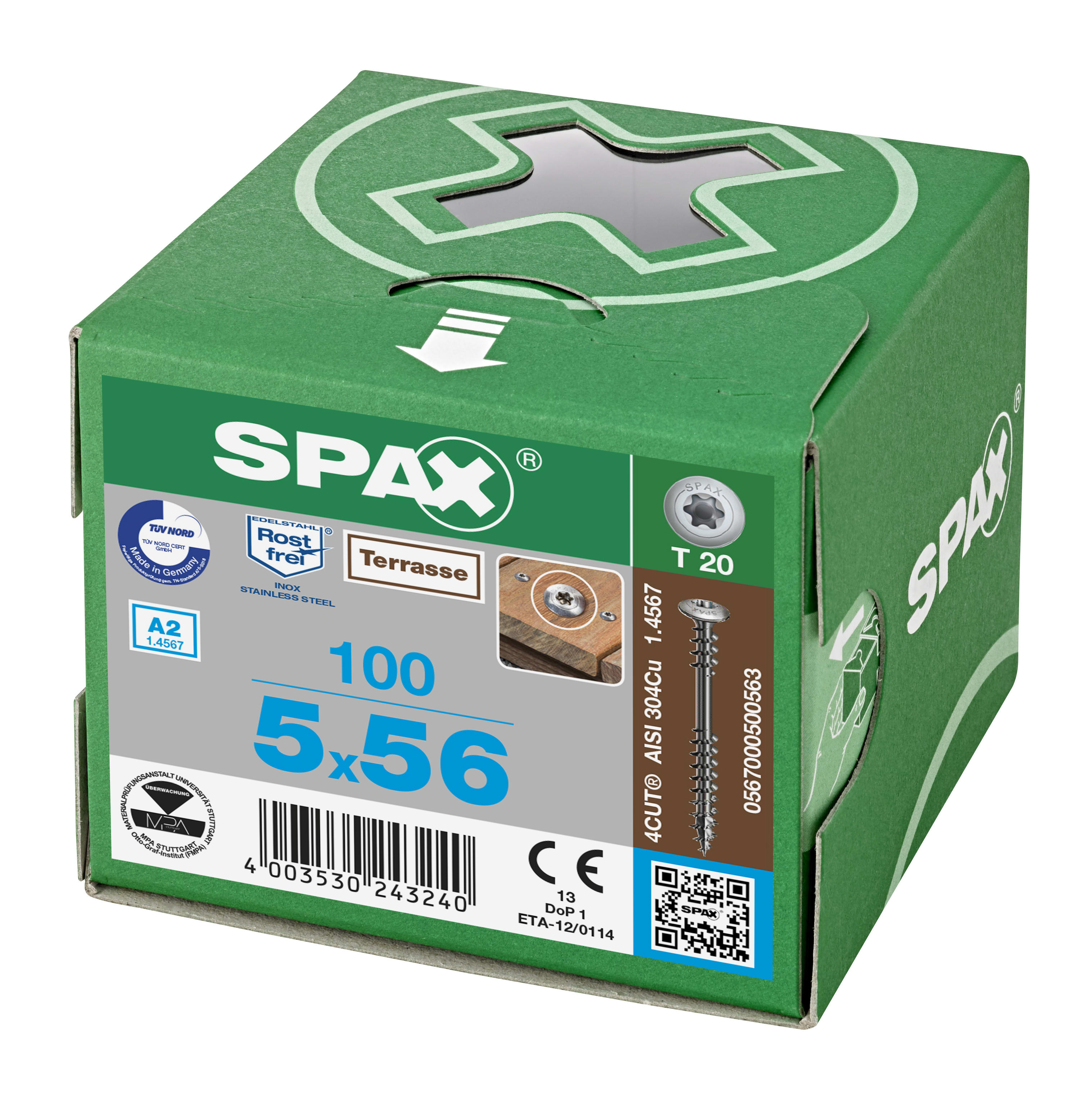 HomeBevestigingsmaterialenSchroevenVlonderschroevenSpax Vlonderschroef 5x56/28mm Sierkop TX-20 RVS A2 100st