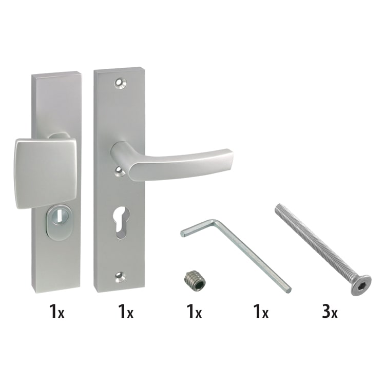 HomeBouwbeslagDeurbeslagDeurschildenStarx Veiligheidsdeurduwergarnituur Duwer-Kruk Recht Langschild PC55 SKG3 Aluminium F1 Met Kerntrekbeveiliging