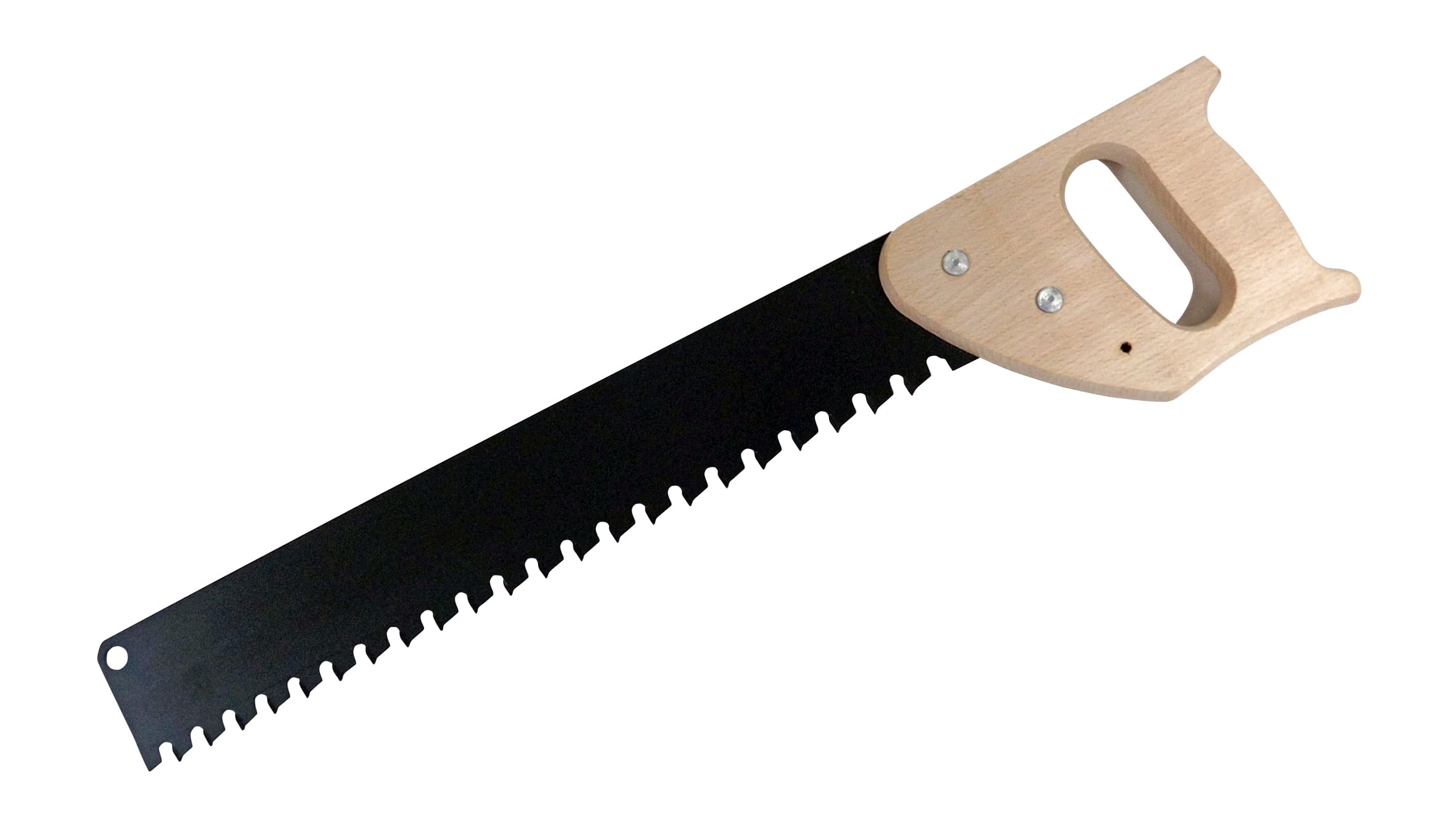 Gasbetonzaag met traditionele houten greep en tandbescherming.