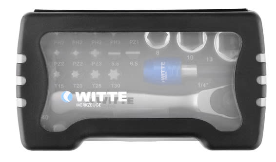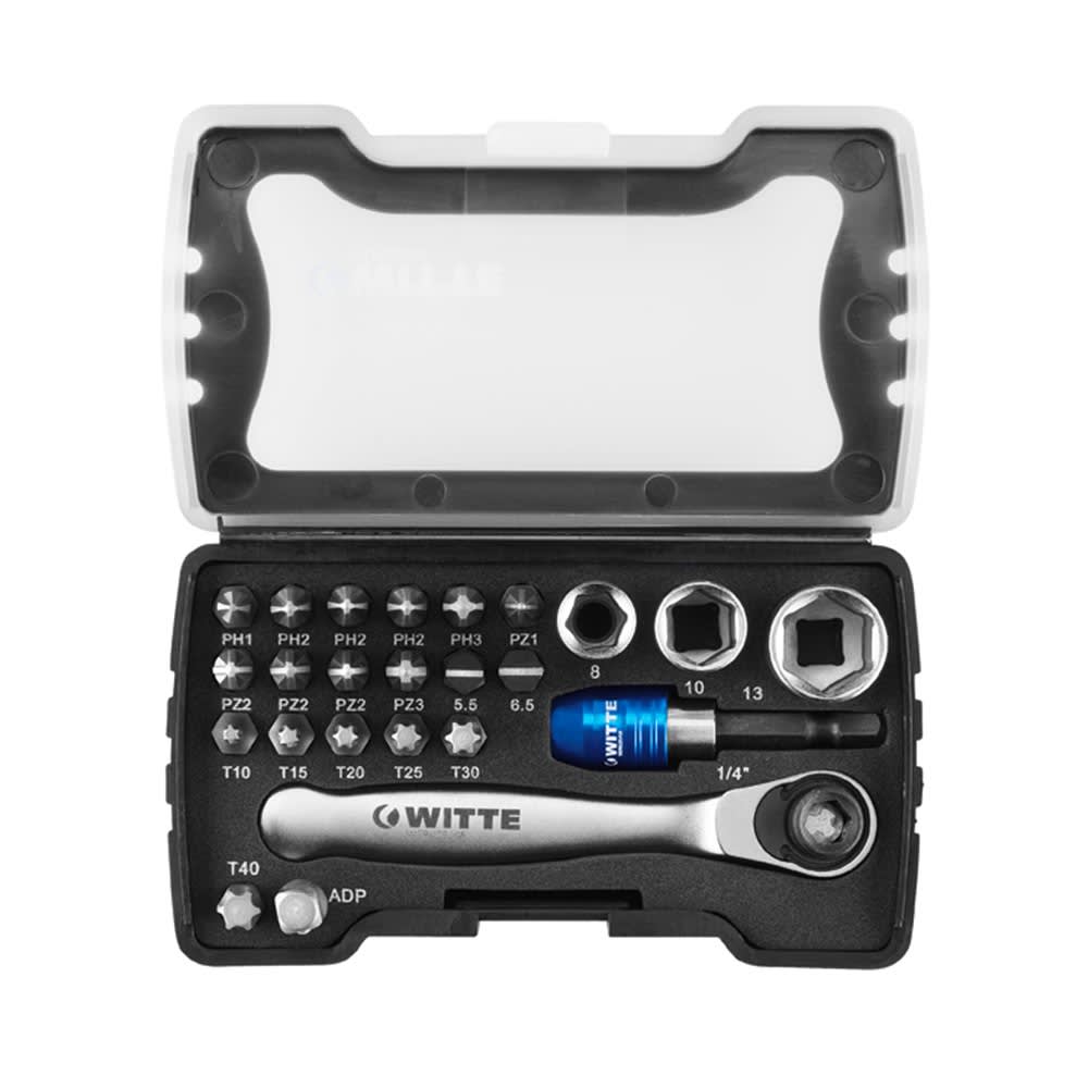 24-delige set bestaande uit: bits, doppen, een adapter, een bithouder en een ratel.
